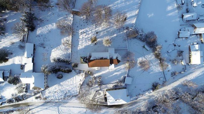 Zasněžený Újezd Sv. Kříže - pohled z nebe (od Alexe a Jakuba Kondrysů)